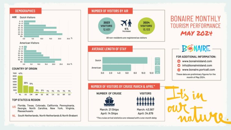 Kralendijk (5 juni 2024) – Tourism Corporation Bonaire (TCB) heeft haar voorlopige cijfers voor mei 2024 bekend gemaakt, waaruit blijkt dat Bonaire in die maand 13.133 verblijfsbezoekers heeft verwelkomd. Dit betekent een stijging van 4% ten opzichte van mei 2023. Vorig jaar heeft Bonaire in dezelfde maand 12.631 verblijfsbezoekers verwelkomd. Als wij gaan vergelijken met de prestaties van vóór de pandemie, dan zien wij dat Bonaire bijvoorbeeld in mei 2019 in totaal 12.000 bezoekers heeft verwelkomd. Deze groei betekent een positieve trend in het toeristische traject van Bonaire.