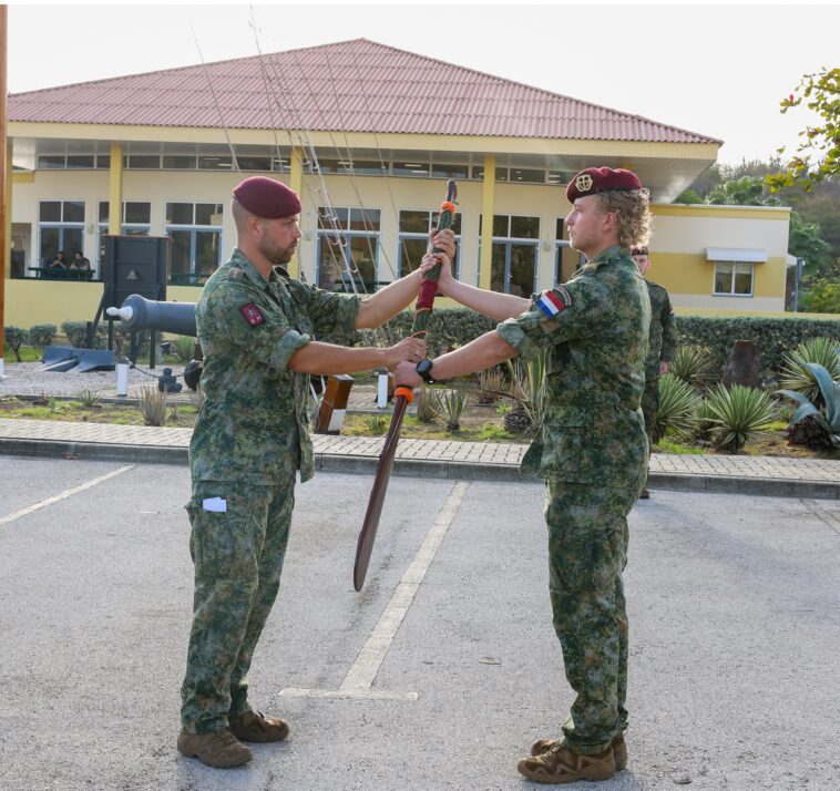 Willemstad – Durante un seremonia militar riba Djaluna 1 di Yüli 2024, den oranan di mainta, ‘Compagnie in de West’ Rotashon 45 a pasa su tareanan pa e siguiente unidat, Rotashon 46. E Komandante nobo Kapitan Jeffrey di e Batayon di Infanteria 13 di Assen, a remplasá su antesesor Kapitan Bernhard, pa medio di e tradishon ‘peddeloverdracht’, ku ta transferensia di e rema, na Kapitan Bernhard.