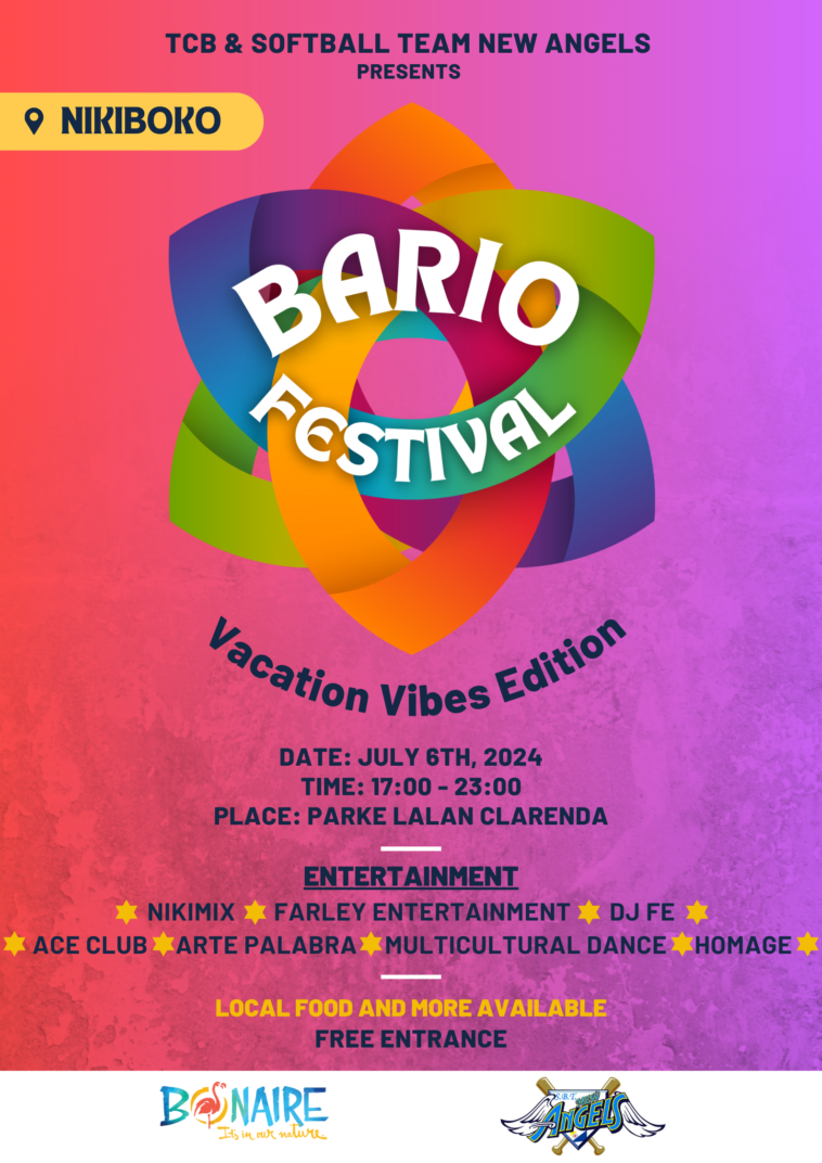 Kralendijk, – Tourism Corporation Bonaire (TCB) and the Softball Team New Angels will organize the first Bario Festival that will take place in Nikiboko. The event will take place at Parke Lalan Clarenda on Saturday, July 6th, 2024 in a great ‘Vacation Vibe’ atmosphere from 5 pm to 11 pm.