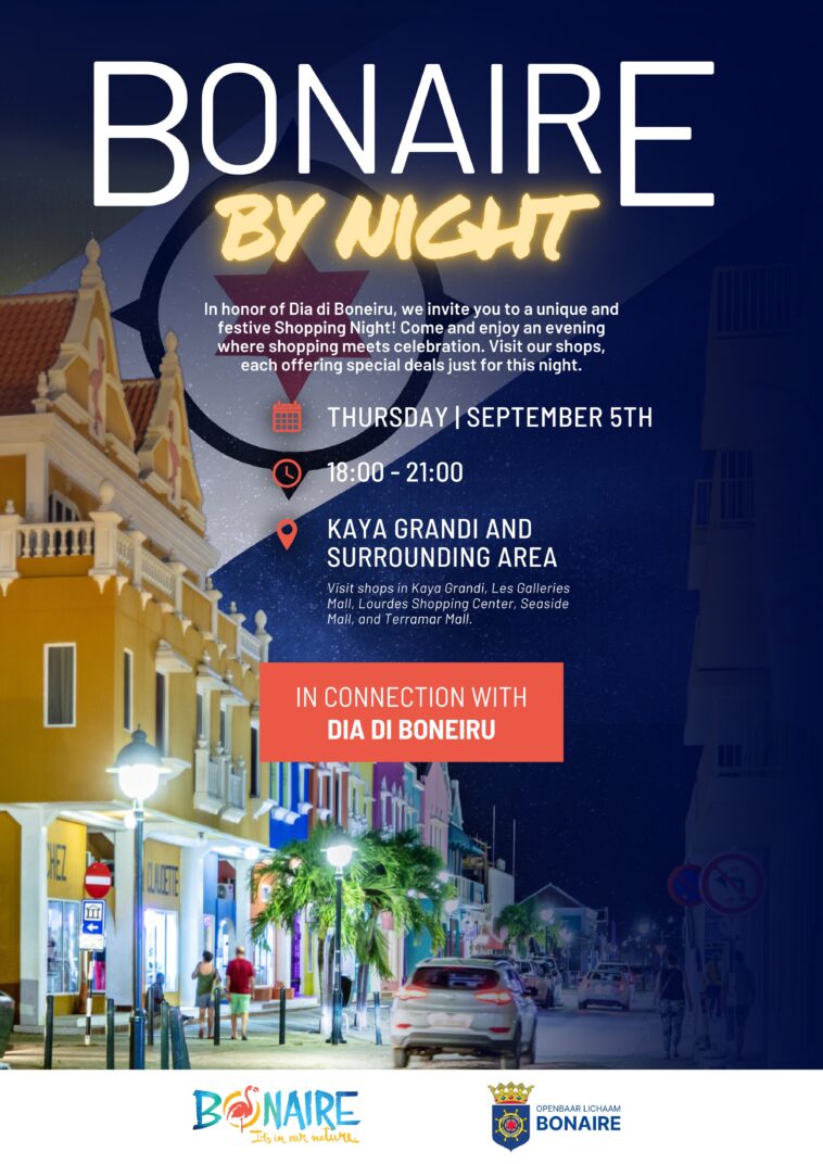 Dit evenement vindt plaats op donderdag 5 september 2024, van 18:00 tot 21:00 uur. Het evenement zal plaatsvinden in Kaya Grandi, het volledige centrumgebied, en Terramar Mall. Het Bonaire by Night-evenement zal elke maand aan het begin van de maand plaats vinden, op de eerste vrijdag. Deze keer vindt het plaats op donderdag, de dag voor Bonaire-dag, wat het thema is.