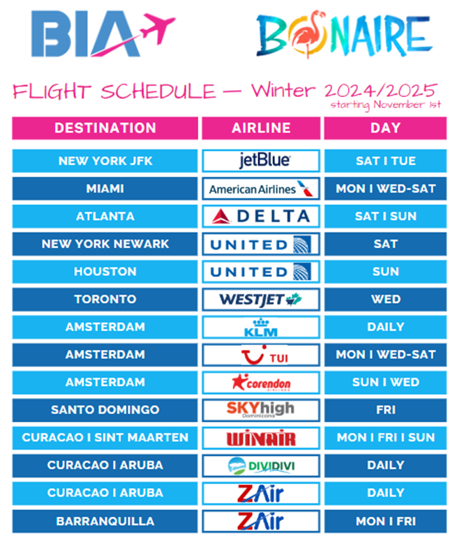 Kralendijk,- International Airport N.V. (BIA) en Tourism Corporation Bonaire (TCB) zijn verheugd het nieuwe vluchtschemavoor komend winterseizoen aan te kondigen. Met een groeiend aantal verbindingen versterkt het eiland zijn positie als aantrekkelijke bestemming voor zowel inwoners, toeristen als zakelijke reizigers.