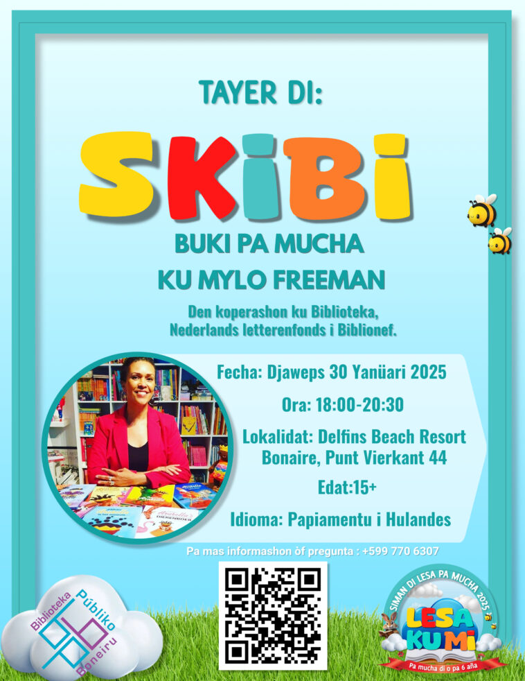 Kralendijk,- Durante e tayer inspirativo aki, Mylo Freeman lo papia tokante su trabou komo eskritor di pa mucha.  Kon bo ta konstruí un bon historia, i ki retonan bo ta enfrentá ora bo ta skirbi pa mucha? Bo lo risibí tambe un tarea di skirbimentu dibertido, ku nos lo deliberá huntu na final di e tayer. E tayer ta grátis, pero inskripshon ta nesesario – no pèrdè!