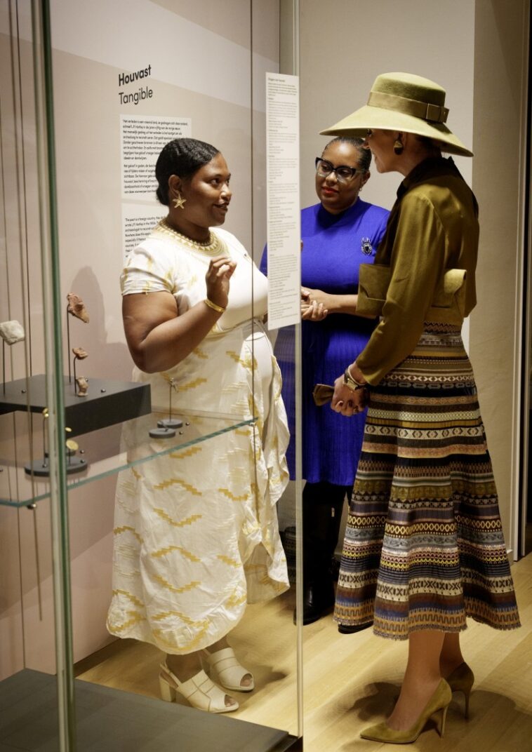 erfgoedprofessionals uit de Cariben met Koningin Máxima over de betekenis van de objecten. Een opvallend stuk is een zeldzame hanger van kornalijn uit ca. 1200–1400, opgegraven op Bonaire in 2022.