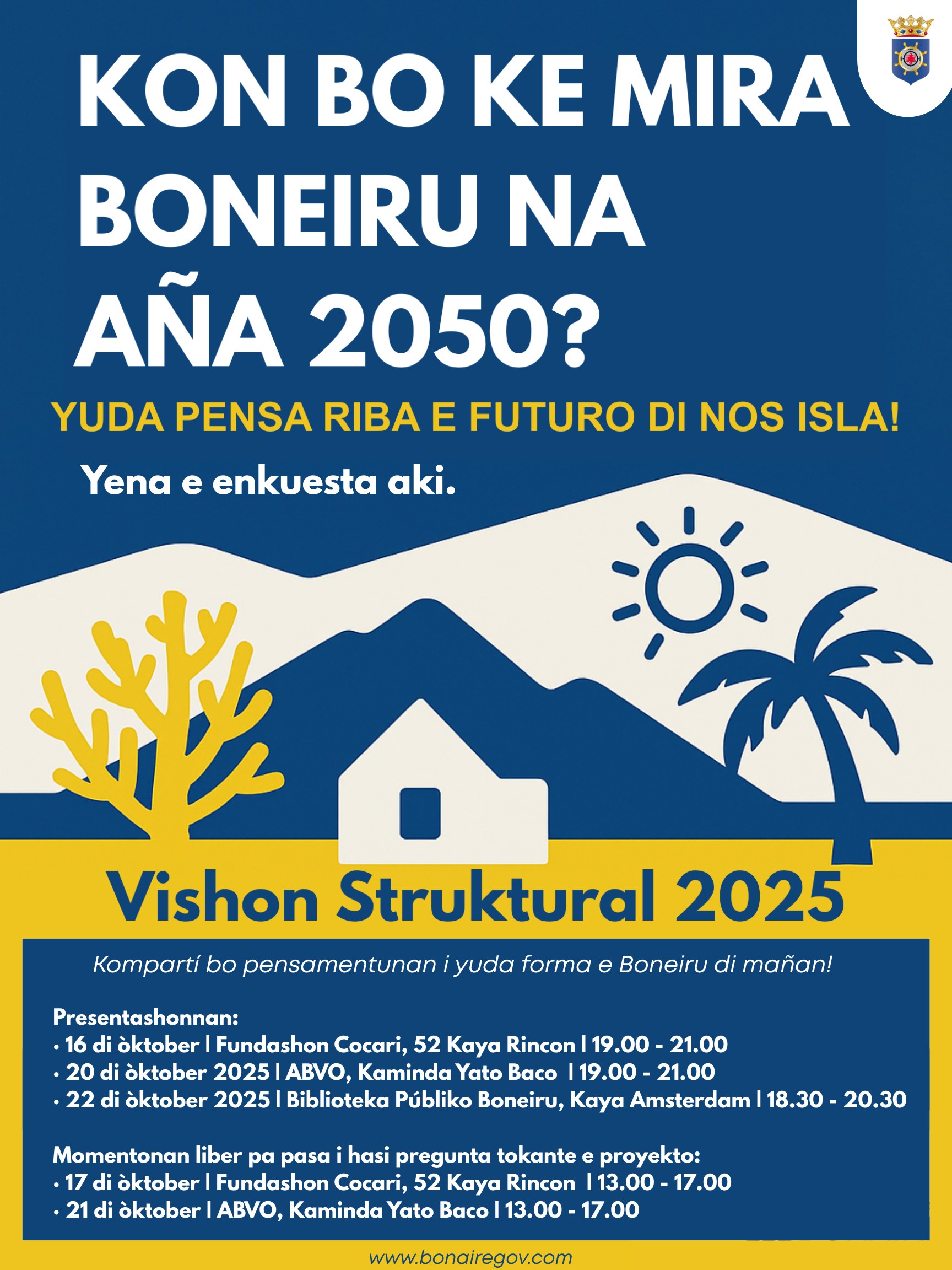 Iedere Bonairiaan wordt uitgenodigd om mee te denken over hoe Bonaire er in 2050 uit moet zien. Via een korte enquête van slechts tien vragen kan iedereen zijn of haar mening geven over belangrijke thema’s zoals wonen, natuur, verkeer, voorzieningen, klimaat en toerisme. De enquête is te vinden via deze link.