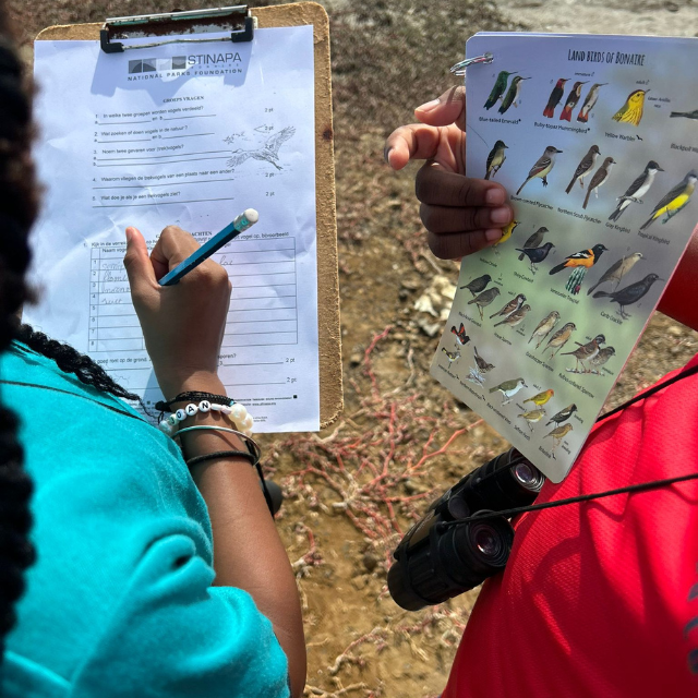 Until recently, STINAPA Wild4life had only a limited number of binoculars. This meant that during school excursions, each child could use a pair of binoculars only for a while, as they had to be shared with other students. “Thanks to the donation from the Vogelbescherming Foundation, more and more children can now observe birds in nature. They can discover birds they did not know before, for them it is ‘exciting’ as the children themselves say,” commented Sint Jago at the end of one of the excursions.