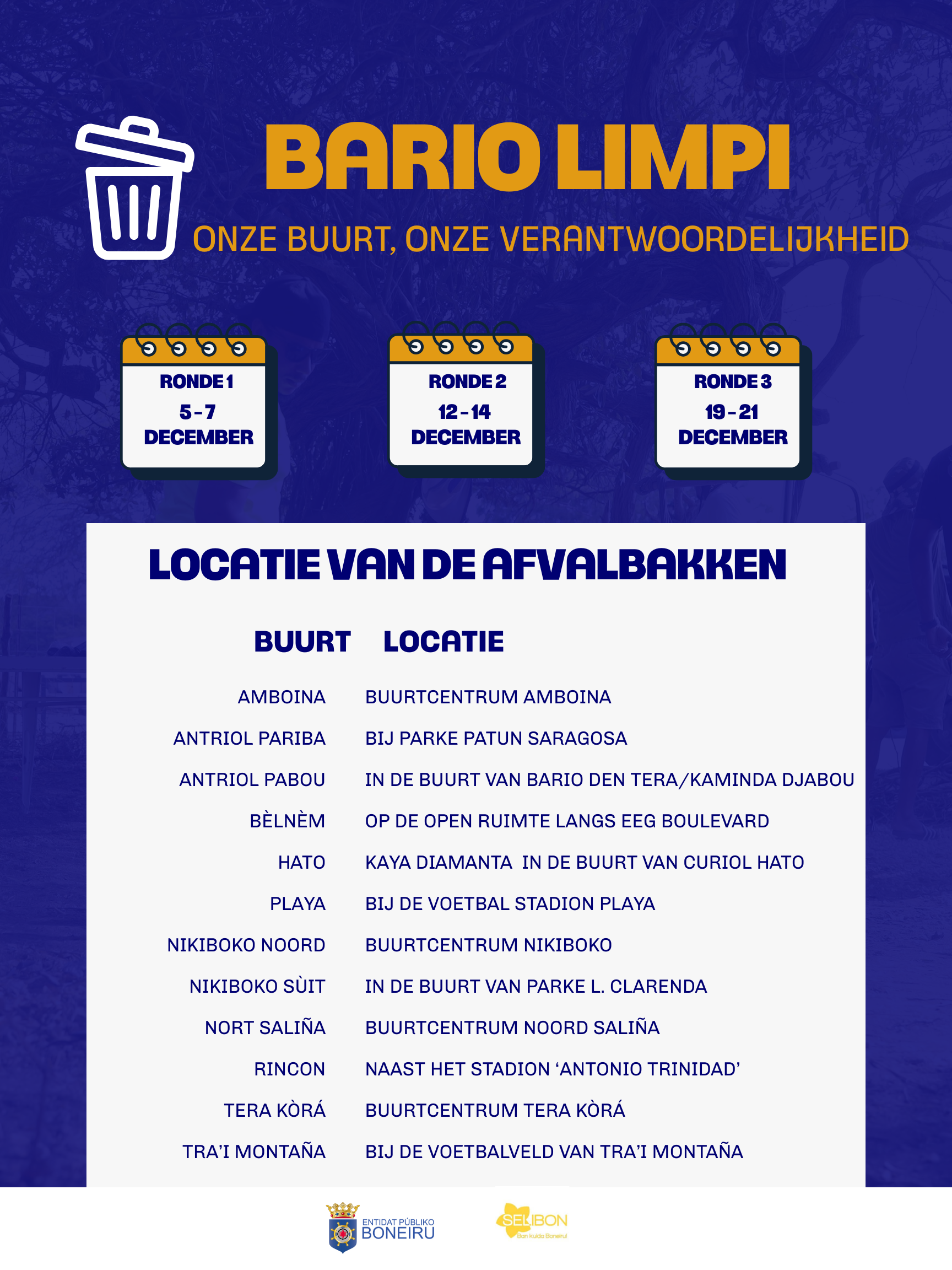 Un bario limpi ta importante pa nos salú, siguridat i habitabilidat. Pa e motibu akí Entidat Públiko Boneiru ta supliká tur habitante: