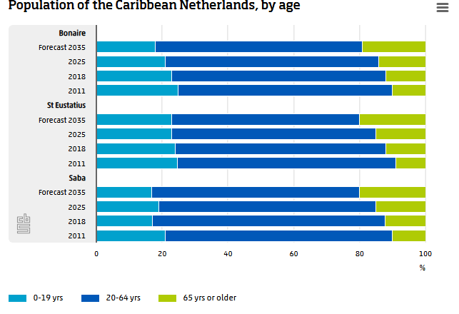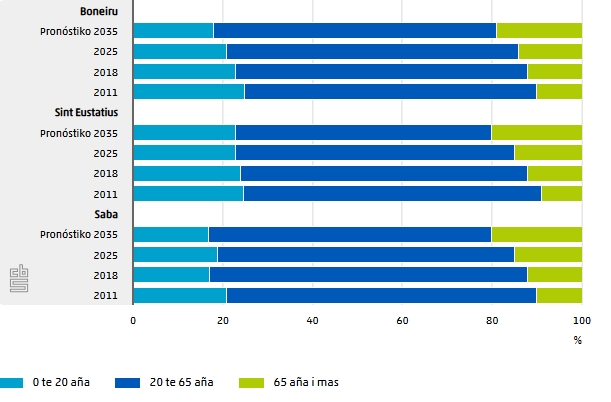 On Saba, 21 percent of the population was aged under 20 in 2011. That is expected to be 17 percent in 2035.