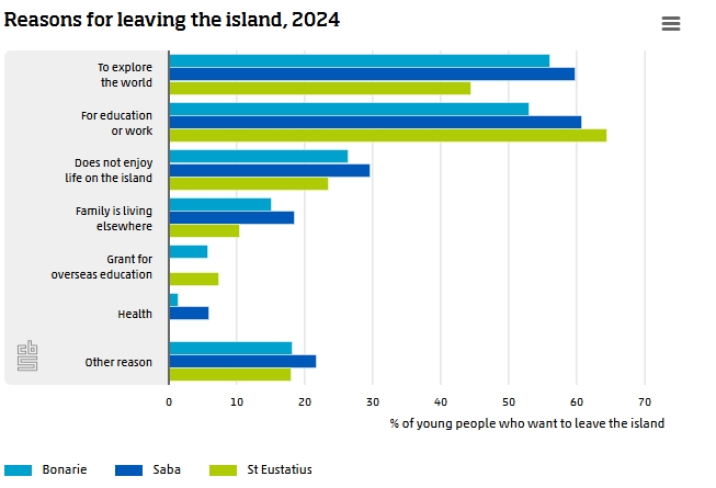 Van de scholieren op Bonaire die het eiland willen verlaten geeft 56 procent als reden op meer van de wereld te willen zien, op Saba is dat bijna 60 procent, op Sint Eustatius minder (45 procent).