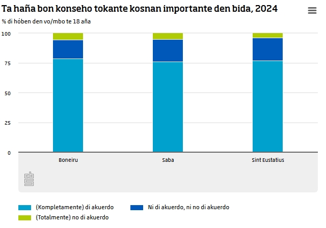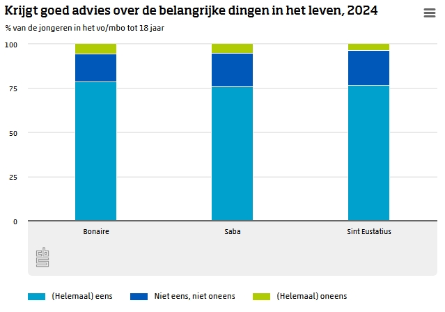 Plannen maken voor de toekomst en op een andere plek gaan wonen zijn belangrijke keuzes, waarbij het nuttig kan zijn om goed advies te krijgen. In 2024 was 79 procent van de scholieren op Bonaire het (helemaal) eens met de stelling “Ik krijg goed advies over de belangrijke dingen in het leven”. Op Saba en Sint Eustatius is dat bijna hetzelfde. Op alle drie de eilanden is 5 procent of minder het (helemaal) oneens met deze stelling.