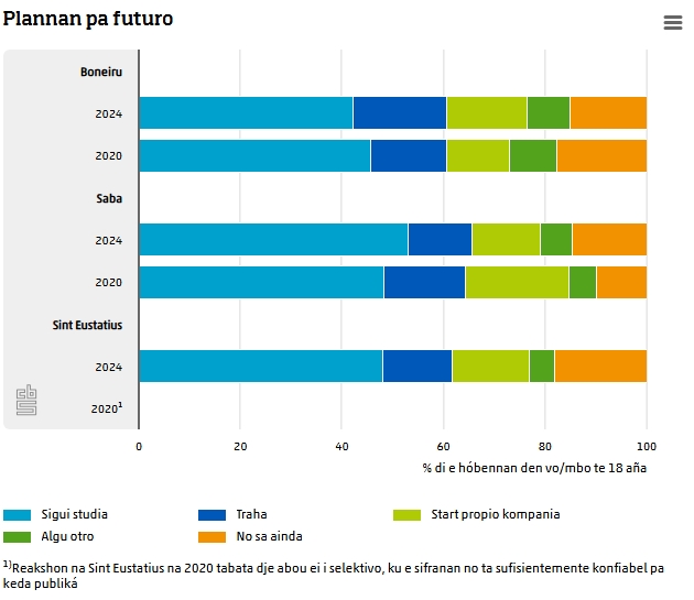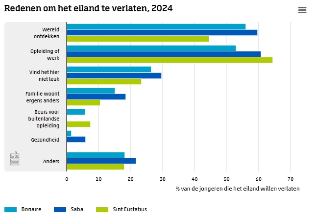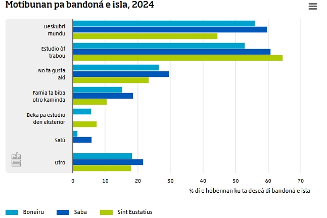 Di e alumnonan di enseñansa sekundario (VO) i enseñansa profeshonal intermedio (MBO), te 18 aña na Saba i Sint Eustatius, 91 porshento ta bisa na 2024 di ta deseá di bandoná e isla den futuro i bai biba otro kaminda. Na Boneiru esei ta 81 porshento. Di e alumnonan na Boneiru algu mas ku 56 porshento ta bisa di ta deseá esei, pa mira mas di mundu, na Saba esei ta kasi 60 porshento, na Sint Eustatius e ta ménos (45 porshento).