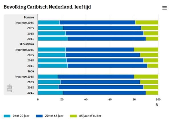 Het aandeel jongeren op de eilanden van Caribisch Nederland neemt over het algemeen af. In 2011 was een kwart van de bevolking op Bonaire 19 jaar of jonger, in 2025 is dat 21 procent. Volgens de laatste bevolkingsprognose zal dat in 2035 18 procent zijn.