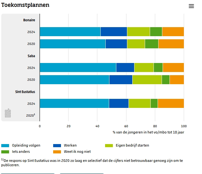 Vergeleken met 2020 willen scholieren op Bonaire iets vaker werken of een eigen bedrijf starten. Op Saba willen scholieren iets minder vaak dan in 2020 een eigen bedrijf starten en zijn ze vaker nog niet zeker van hun toekomstplannen.