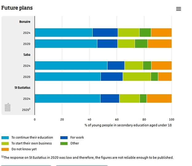 Among school students on Bonaire aged under 18 in secondary education, 42 percent want to continue their education, but this will mean leaving the island. Among students on Saba and St Eustatius, the percentage was 53 percent and 48 percent, respectively. The majority of the students who intend to remain on the islands want to find a job or start their own business. A minority indicate that they do not know yet.