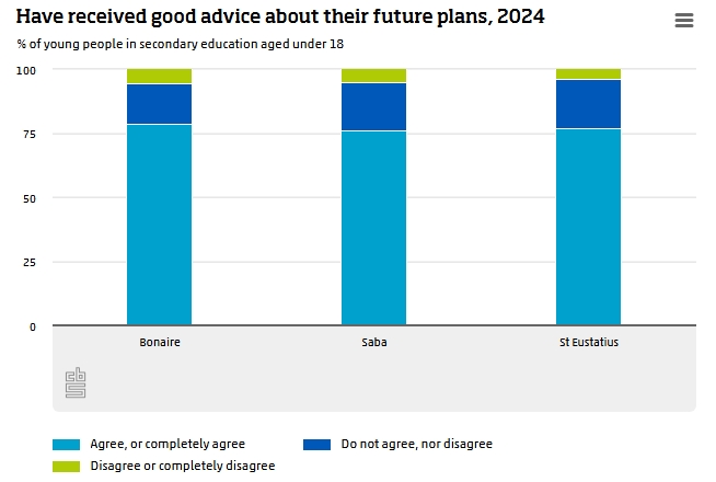 Making plans for the future and moving to another country are major decisions, and good advice can help young people to make the right choices. In 2024, 79 percent of students on Bonaire agreed with the statement ‘I have received good advice about making plans for my future’. The percentages for Saba and St Eustatius were almost the same. On all three islands, 5 percent or less disagreed with the statement.