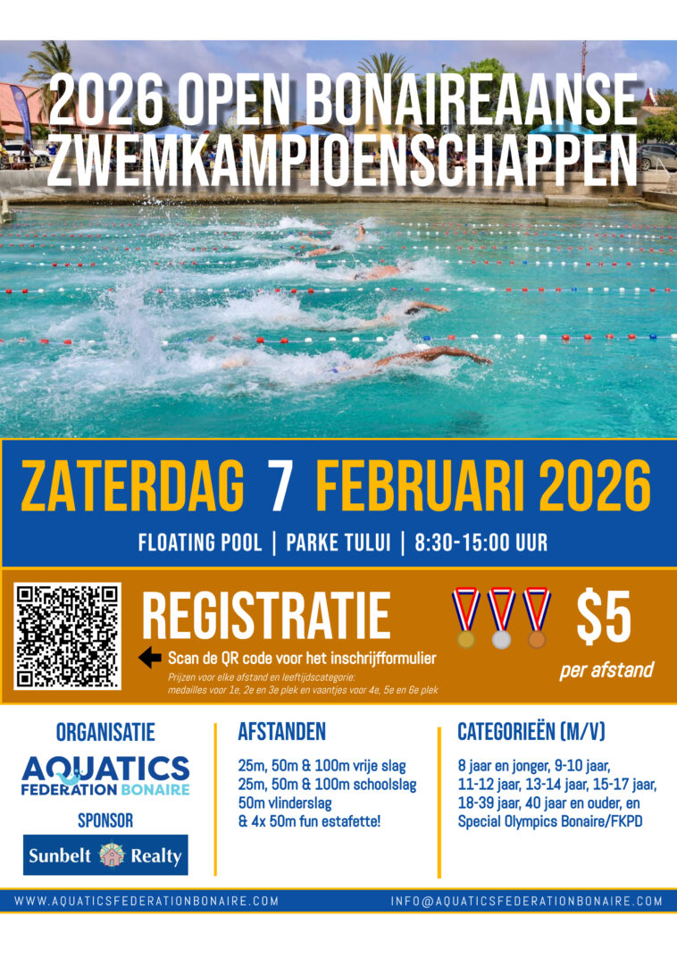 Kralendijk,- Op zaterdag 7 februari 2026 vindt de derde editie van de Open Bonaireaanse Zwemkampioenschappen plaats.