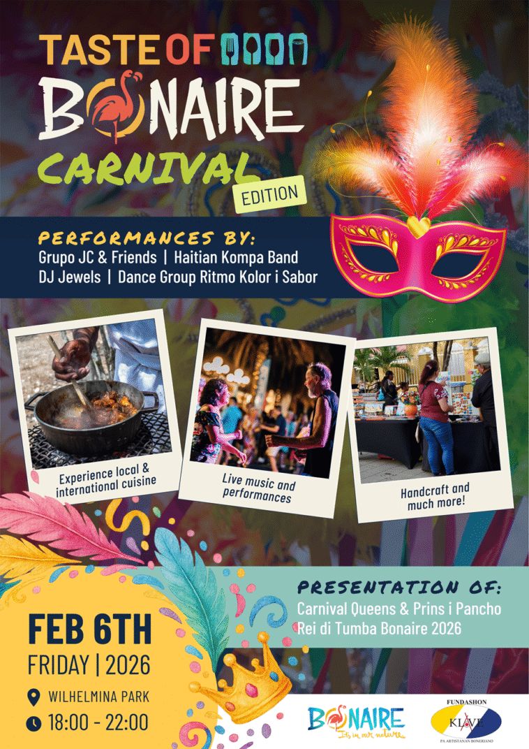 Wij nodigen alle inwoners van Bonaire en ook al onze bezoekers uit om een gezellige avond samen met ons te komen doorbrengen op vrijdag 6 februari 2026 bij de eerste Taste of Bonaire van 2026, editie Karnaval in het Wilhelmina Park.