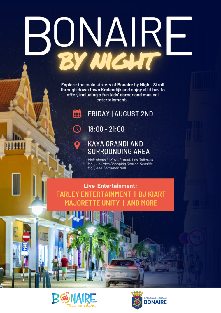 Tijdens het evenement zal Kaya Grandi worden afgesloten voor verkeer. Bezoekers en inwoners krijgen de gelegenheid om rond te lopen, te genieten van de sfeer van Bonaire by Night in de stijl van een Shopping Night, en te winkelen in het hele Kralendijk-gebied. Op verschillende locaties in Kaya Grandi en het centrumgebied zal er muziek zijn van onder andere DJ Kiart en Farley Entertainment. Om de nodige sfeer te creëren, zal er een Majorette-show zijn en een Kids Corner.
