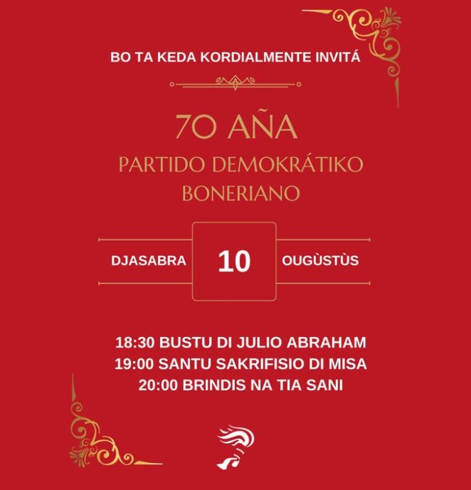 Kralendijk – Dia 10 di ougùstùs 2024 nos lo selebrá un logro spesial: 70 aña di Partido Demokrátiko Boneriano. Pa shete dékada, nos partido ta luchando inkansabelmente pa dignidat i bienestar di nos pueblo. Komo un partido Sosial Demókrata, semper nos a tene nos mes na e balornan ku a guia nos for di kuminsamentu. Sea nos tabata den gobièrnu òf den oposishon, Partido Demokrátiko Boneriano semper a para banda di esnan ku mas mester di yudansa, garantisando ku niun hende no ta keda atras.