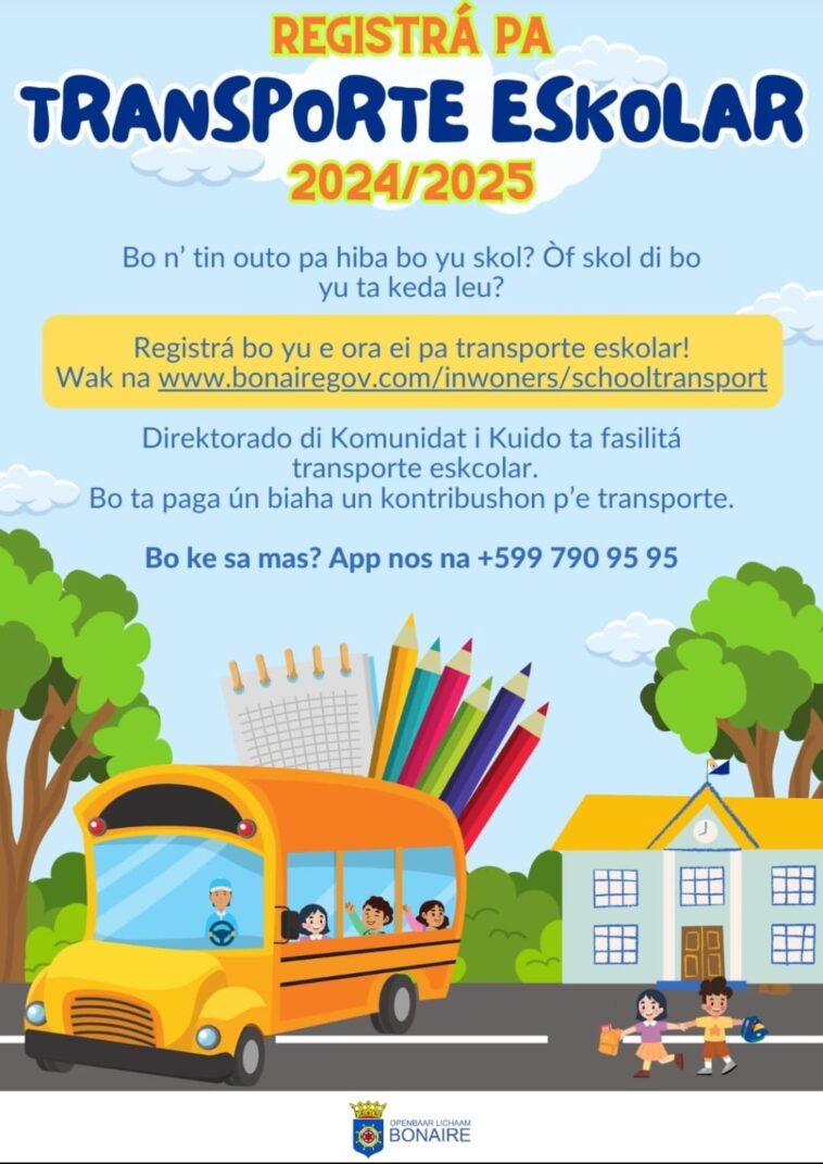 Kralendijk, – Mayor/tutor di alumno di skol básiko, skol sekundario òf mbo, por apliká awor pa transporte eskolar pa nan pa aña eskolar 2024-2025. E transporte ta pa mayor/tutor ku no por hiba yu skol komo ku nan no tin outo. Pa bini na remarke pa transporte eskolar, mayor/tutor por apliká na