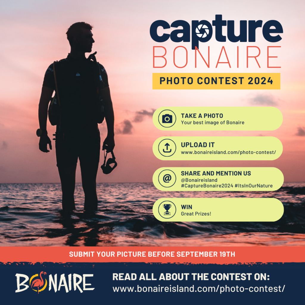 Resientemente TCB a anunsiá tambe e siguiente edishon di ‘Capture Bonaire Photo Contest 2024’. E kompetensia ta dura kuater siman, for di 23 di ougùstùs te 19 di sèptèmber 2024. Dia 23 di sèptèmber 2024 for di tur e potrètnan ku ta bini na remarke, ta selektá i anunsiá e tres mihó ganadónan riba e wèpsait www.bonaireisland.com/photo-contest.