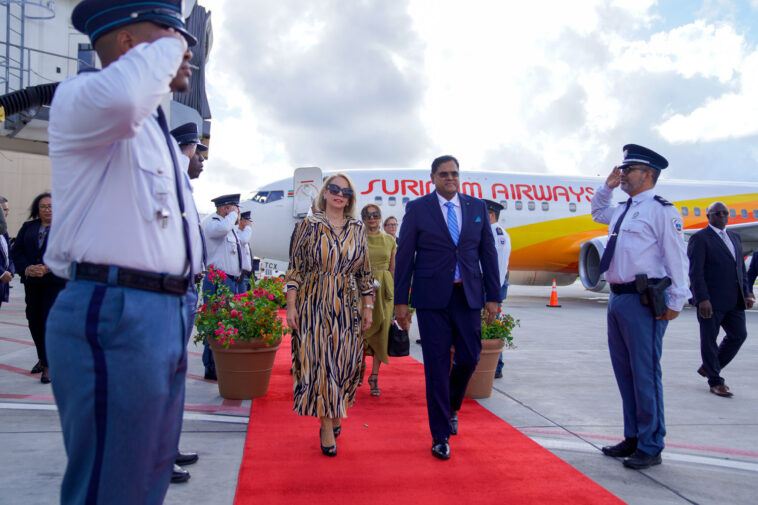 Oranjestad- Dialuna mainta trempan, cu e vuelo di Surinam Airways, President Chan Santokhi, su esposa First Lady y Presidente di Relacion Exterior señor Albert Ramdin, a yega Aruba.