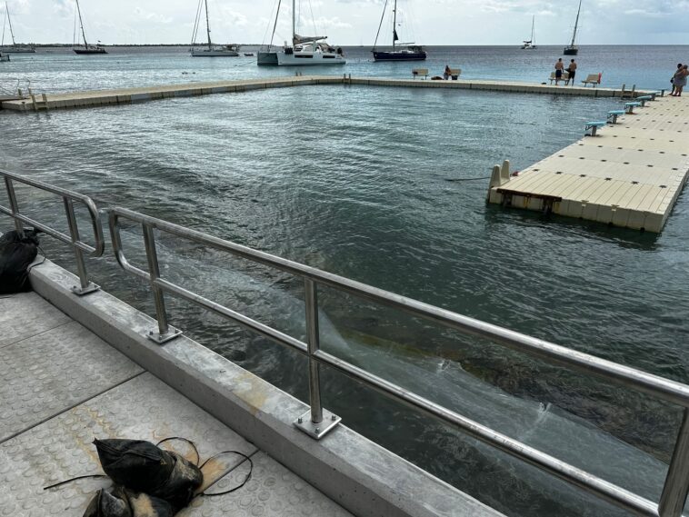 E proseso tin algun retraso si pa motibu di entrega di materialnan. E blokinan di konstrukshon si ta wordu kitá, pero nos ta antisipa ku e ultimo fase di e trabou lo kaba rònt di fin di yanüari. Na e momentu aki, e area ta keda habri i lo por bai den awa for di e rampa, pero e rampa no ta kompletamenta aksesibel pa hendenan den rolstul.