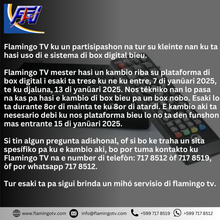 Si tin algun pregunta adishonal, of si bo ke traha un sita spesífiko pa ku e kambio aki, bo por tuma kontakto ku Flamingo TV na e number di telefòn: 717 8512 òf 717 8519, òf por whatsapp 717 8512.