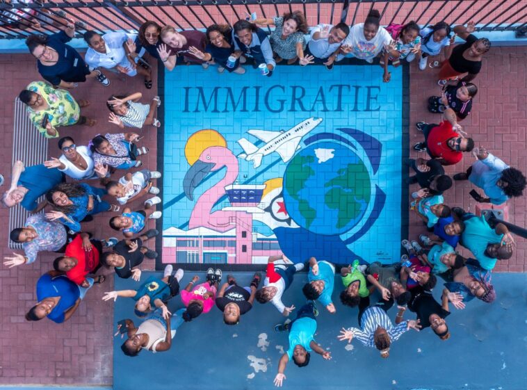 Kralendijk,- De IND meldt met trots dat de winnende tekening van de recente tekenwedstrijd is omgezet in een kunstwerk! Geïnspireerd door het creatieve ontwerp van een getalenteerde leerling Brayden Oleana van school San Bernardo, heeft street-artist Marz een kunstwerk gemaakt op de buitenvloer bij de ingang van het IND-gebouw.