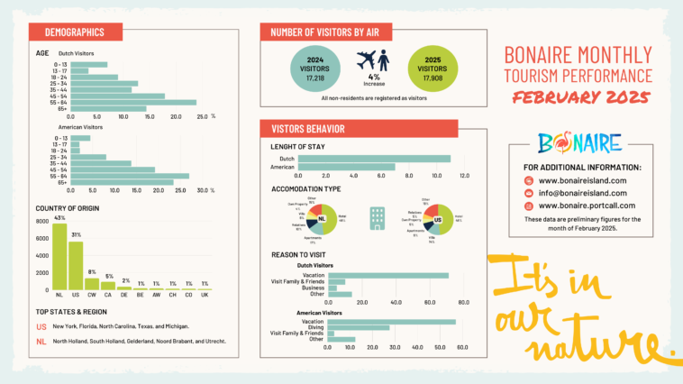 Kralendijk,- Tourism Corporation Bonaire (TCB) has shared preliminary tourism data for February 2025, revealing that Bonaire received 17,908 stayover visitors.