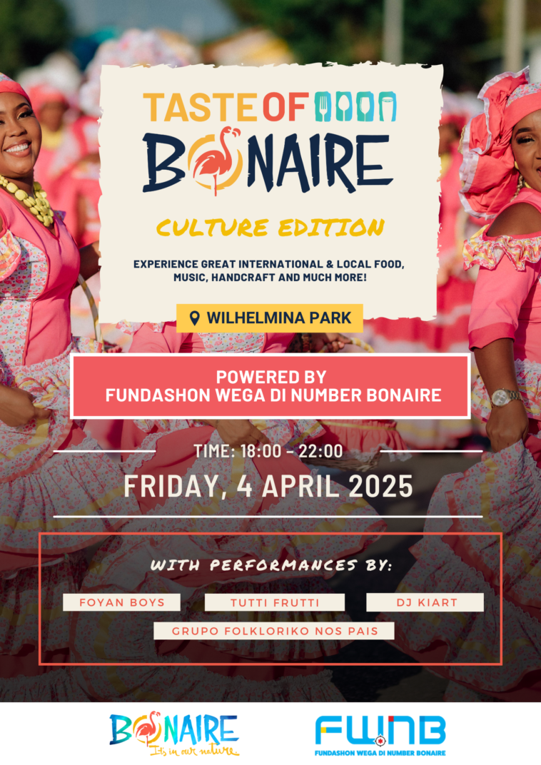 We invite all Bonaire residents and visitors to come and spend a pleasant evening with us on Friday, April 4th, 2025, at the first Taste of Bonaire of this year, the Culture edition in Wilhelmina Park.