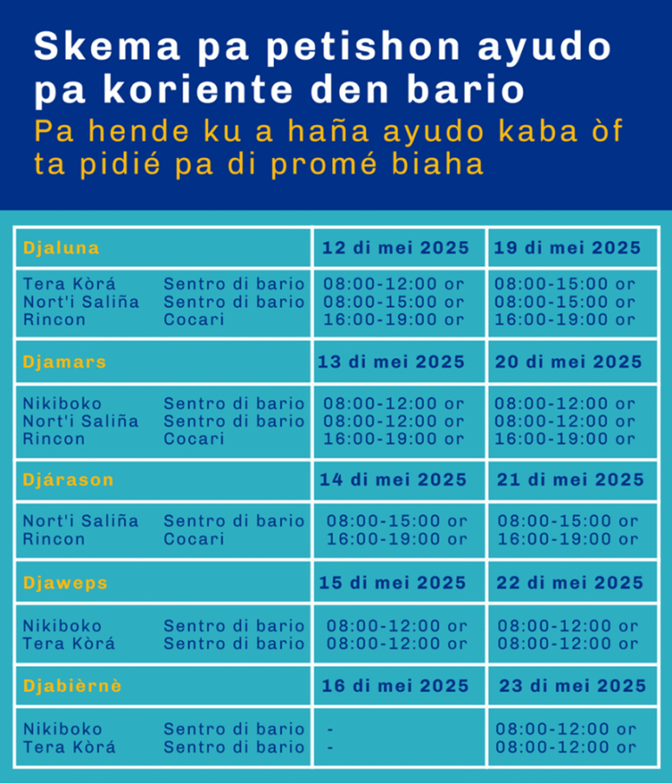 Daarom is er gekozen om burgers tijdelijk de aanvraag persoonlijk te laten doen in de wijk terwijl er gewerkt wordt om het technische probleem op te lossen. Vanaf maandag 12 mei 2025 tot en met 23 mei 2025 kunnen burgers in de wijk de hulp aanvragen voor het betalen van de stroomrekening van WEB of PAGABON. Dit is voor de mensen die de hulp eerder kregen, of de hulp voor het eerst aanvragen. De aanvragen kunnen bij de sentro di bario in Nikiboko, Nort’i Saliña, Tera Kòrá en Cocari in Rincon worden gedaan.