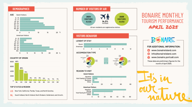 Kralendijk,- Tourism Corporation Bonaire (TCB) has shared preliminary tourism data for April 2025, revealing that Bonaire received 18,858 stayover visitors. This represents a 14.3% increase compared to April 2024, when 16,505 visitors arrived.