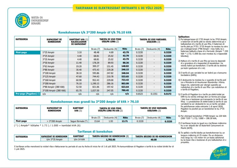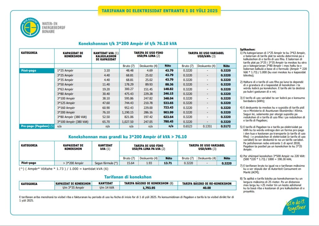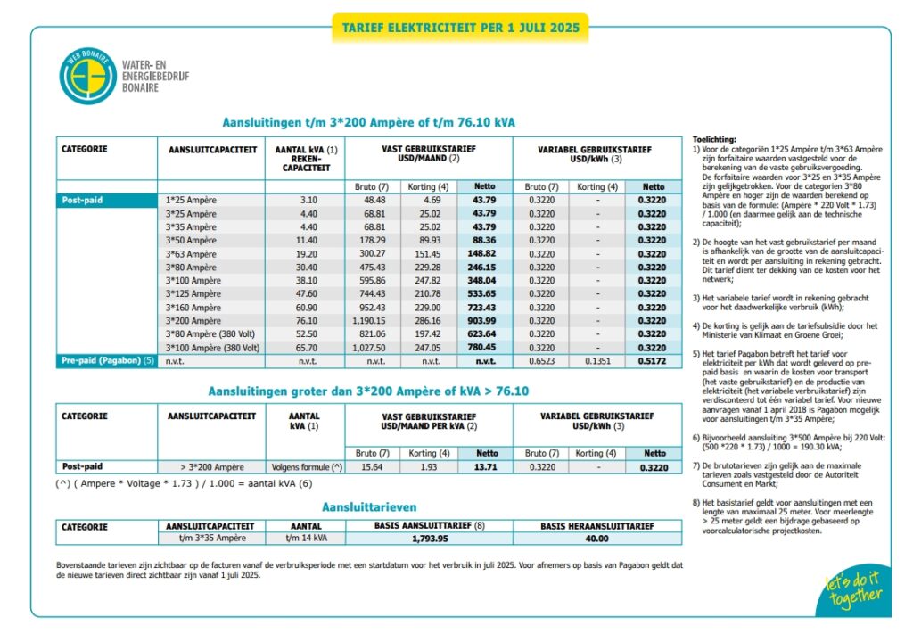 Pa usuarionan pre[1]pago (Pagabon), e tarifa ahusta lo ta visibel mesora for di 1 di yüli 2025. Bo por haña e lista kompleto di tarifnan pa elektrisidat ku ta valido for di 1 di yüli 2025 na: www.webbonaire.com