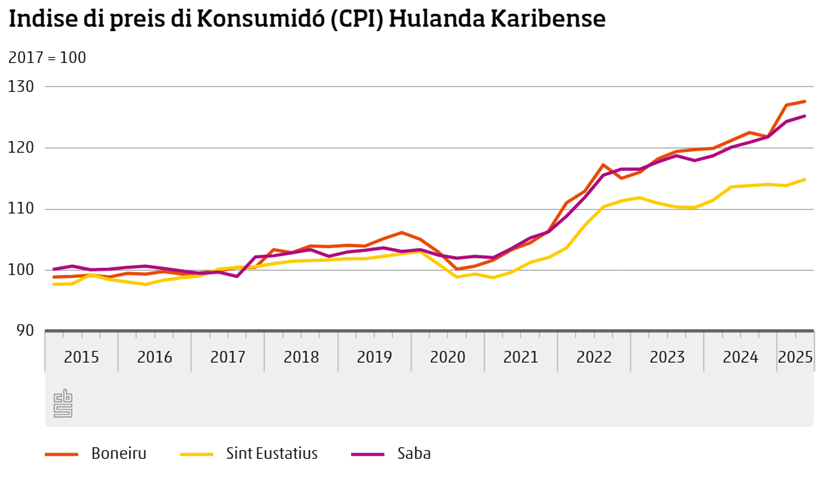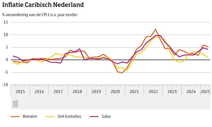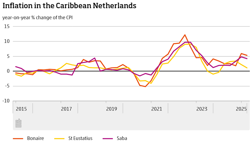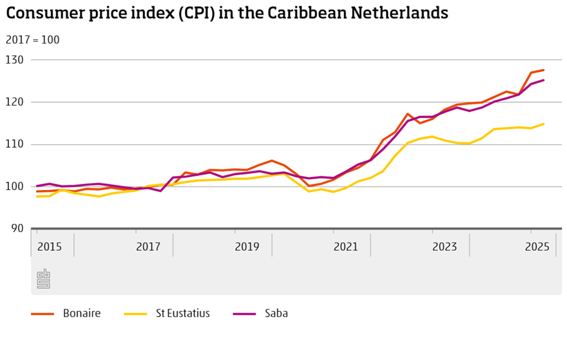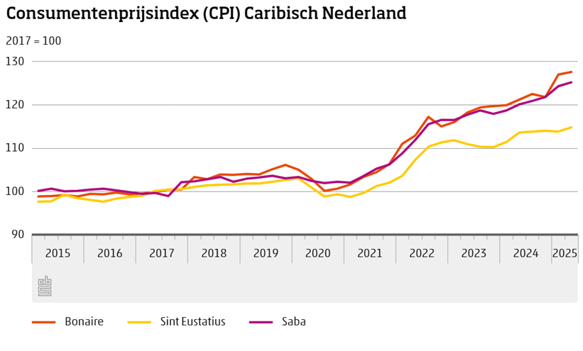 Op Sint Eustatius waren de prijzen op jaarbasis 1,1 procent hoger in het tweede kwartaal van 2025, in het eerste kwartaal was de inflatie 2,2 procent. Op Saba was de inflatie 4,2 procent in het tweede kwartaal, een kwartaal eerder 4,8 procent.