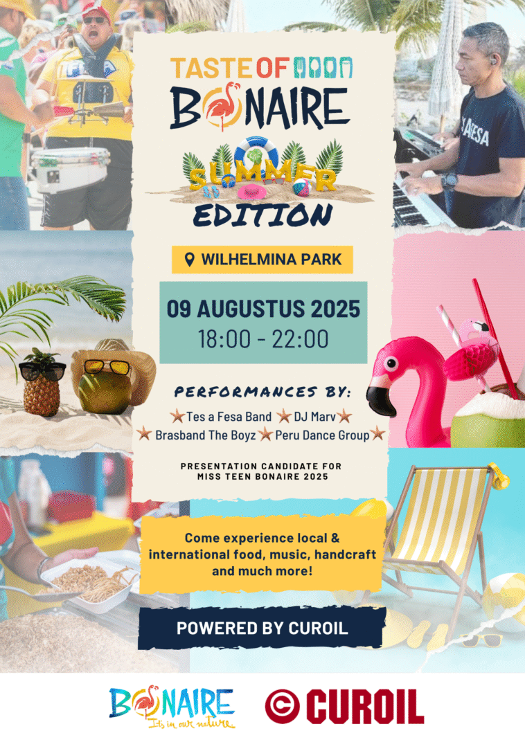 We invite all Bonaire residents and visitors to join us for a fun evening on Saturday, August 9, 2025, at the third Taste of Bonaire, Summer, in Wilhelmina Park, sponsored by Curoil.