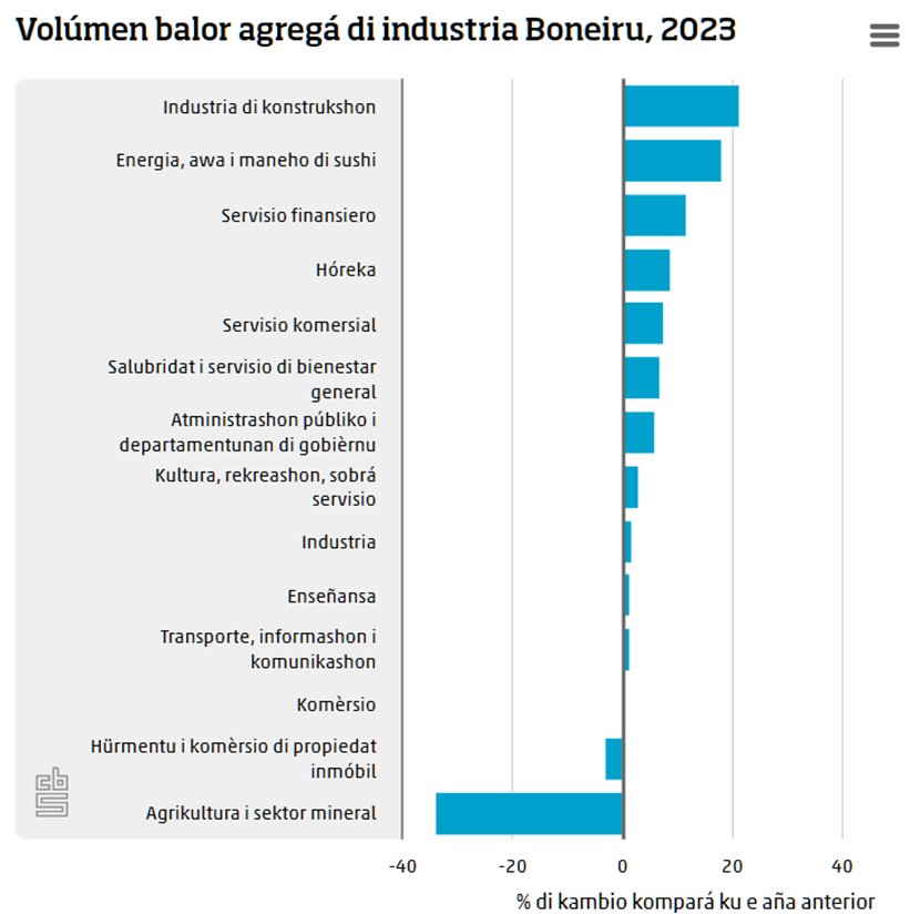 Kralendijk,- Ekonomia di Boneiru a krese, den 2023 ku 6,3 porshento. Partikularmente e industria di konstrukshon, energia i hóreka a duna un aporte grandi na e kresementu.
