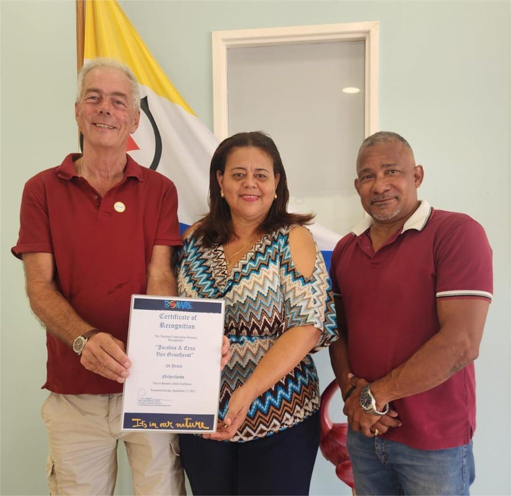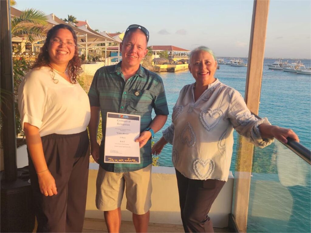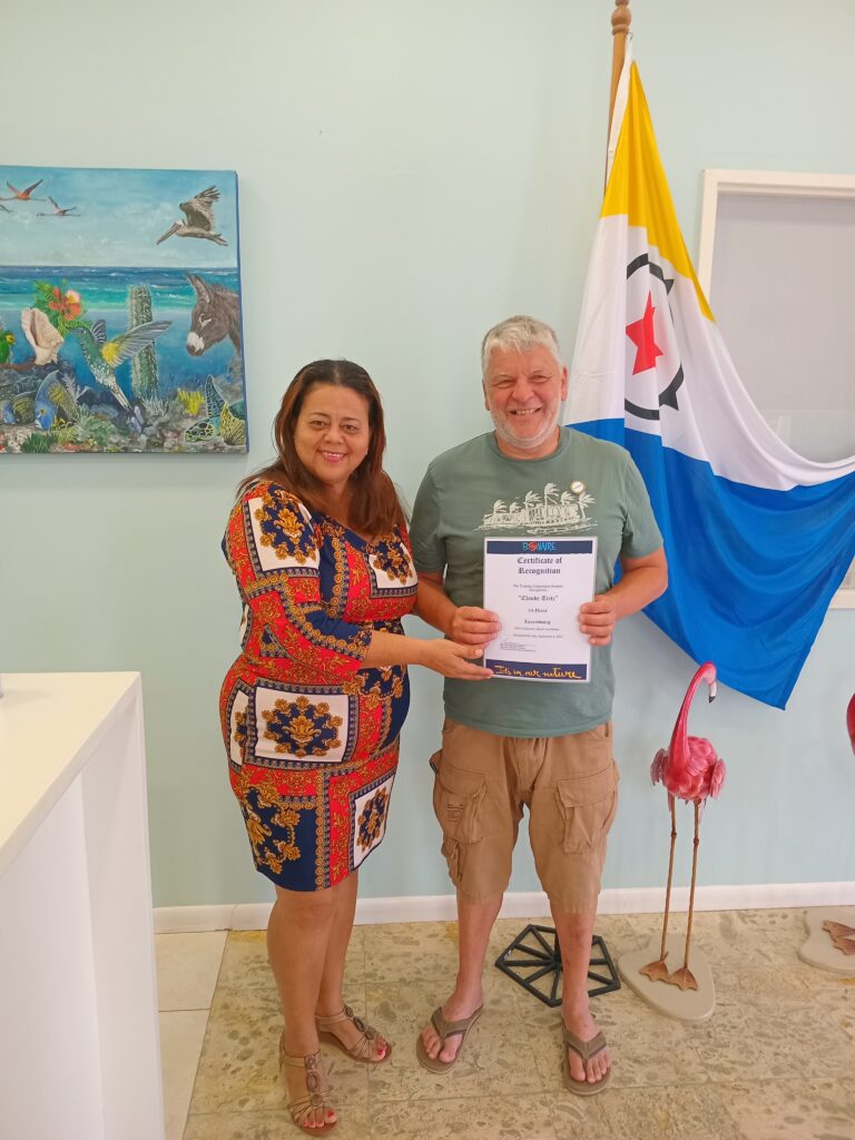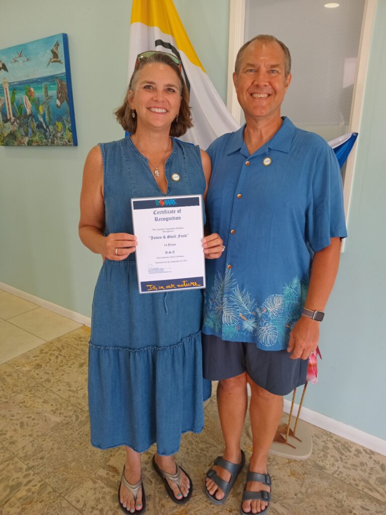 In the bronze category, Casey Straub, who has been visiting Bonaire for 10 years, was recognized. In the same category, Claude Tritz, along with James and Shelly Funk, were also honored for their 14 years of visiting our island.