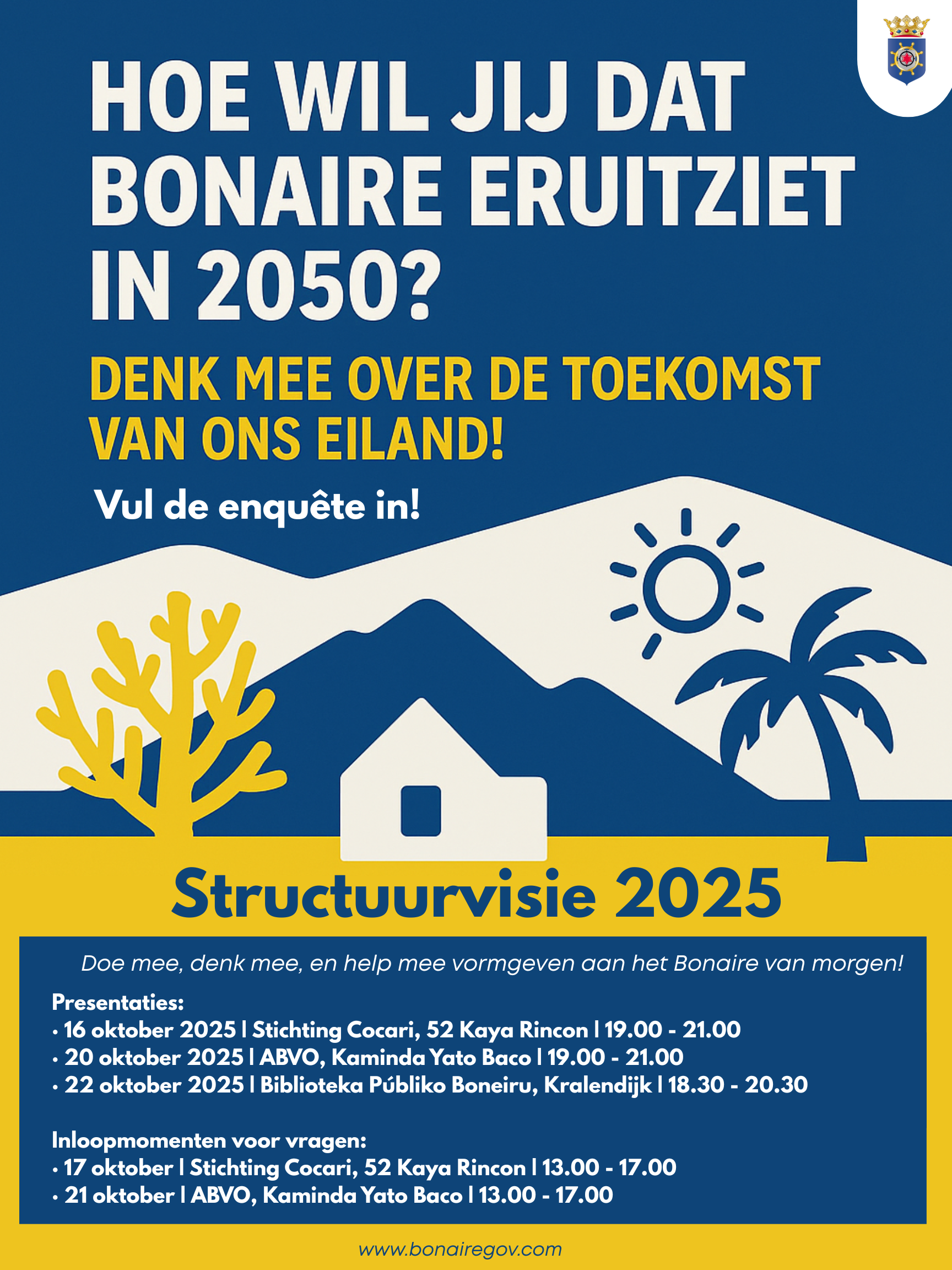 Iedere Bonairiaan wordt uitgenodigd om mee te denken over hoe Bonaire er in 2050 uit moet zien. Via een korte enquête van slechts tien vragen kan iedereen zijn of haar mening geven over belangrijke thema’s zoals wonen, natuur, verkeer, voorzieningen, klimaat en toerisme. De enquête is te vinden via deze link.
