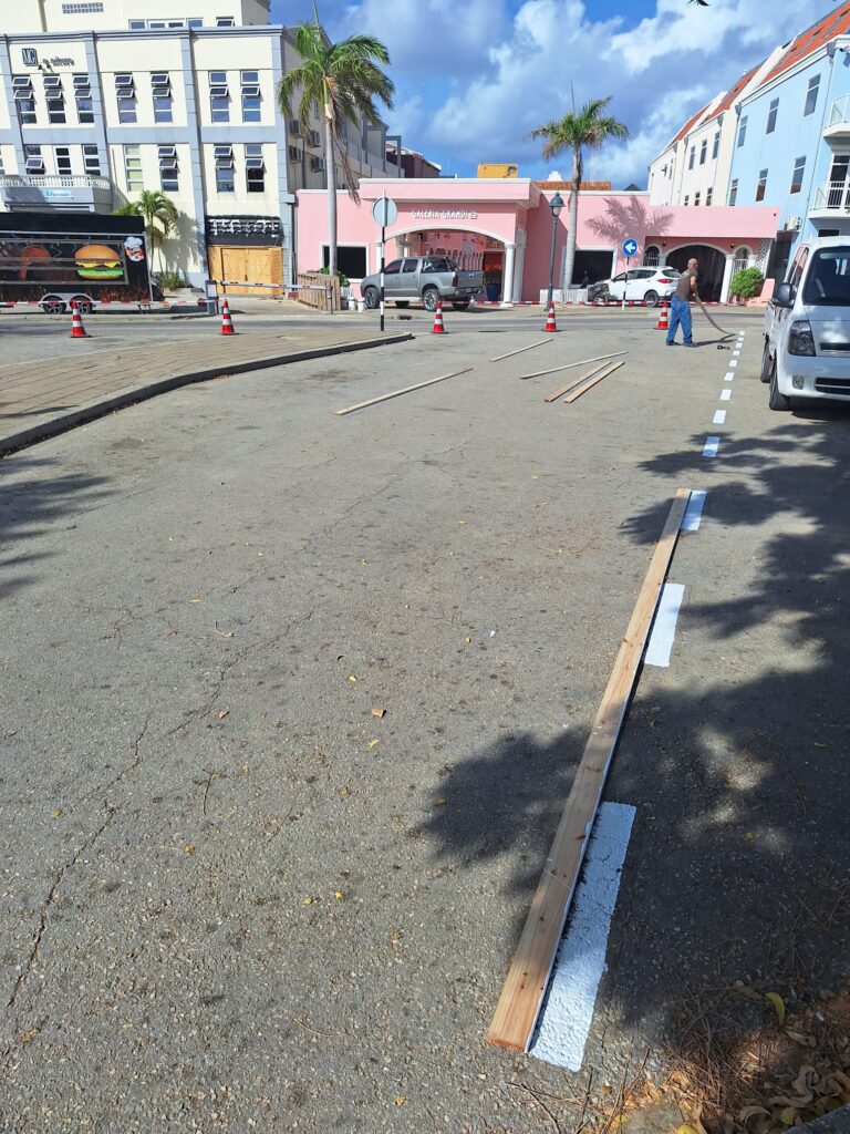 Kralendijk -A renobá markashon di kaminda i markashon di e espasionan pa stashoná outo den sentro di siudat, konosí komo ‘centrumgebied’ na Playa, pa mehorá siguridat di tráfiko i pa krea un mihó bista pa usuarionan di kaminda. Resientemente e unidat di Trabou Públiko di Direktorado di Planifikashon i Desaroyo a finalisá e trabounan.