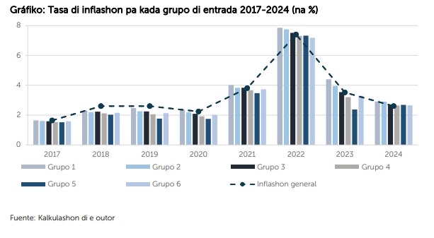 E estudio, ehekutá dor di Robert Hieroms, spesialista riba tereno di análisis i investigashon ekonómiko di CBCS, ta duna un kalkulashon di e tasa di inflashon pa seis grupo di entrada durante e periodo di 2017-2024. Último añanan, oumento di preis di komestibel, bibienda i energia tabatin un efekto desproporshonal riba e kasnan di famia ku tin ménos entrada.
