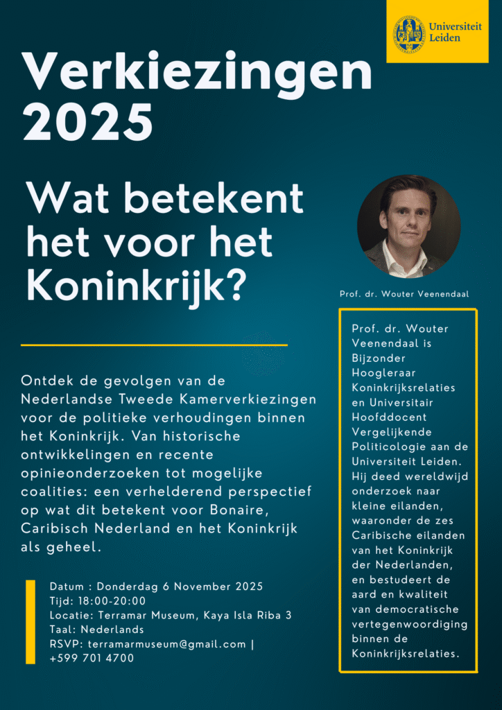 Kralendijk – Het Terramar Museum nodigt het publiek van harte uit voor een openbare lezing door Wouter Veenendaal, Bijzonder Hoogleraar Koninkrijksrelaties en Universitair Hoofddocent Vergelijkende Politicologie aan de Universiteit Leiden.