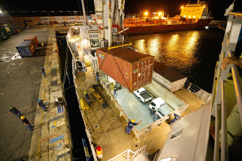 The containers on board are filled with over 150,000 cans of food and other basic necessities such as solar-powered lamps, jerrycans, and generators.