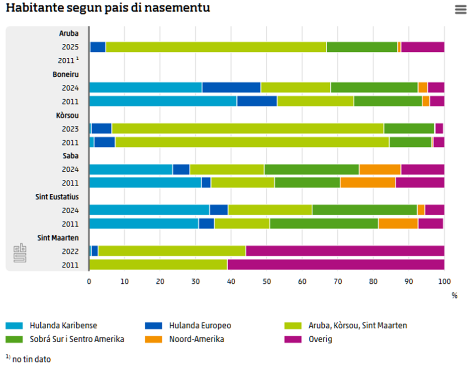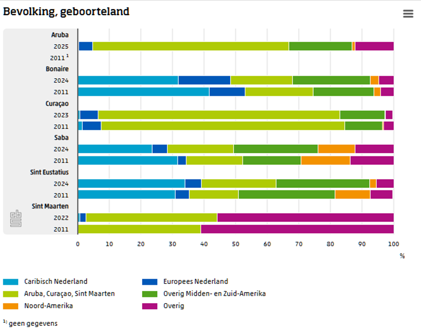 Op Bonaire daalde het aandeel op dat eiland geboren inwoners van 42 procent in 2011 naar 30 procent in 2025. Het aandeel geboren in Europees Nederland steeg van 11 procent naar 17 procent, en het aandeel inwoners met een geboorteland in Zuid- en Midden-Amerika nam toe van 19 procent naar 26 procent.