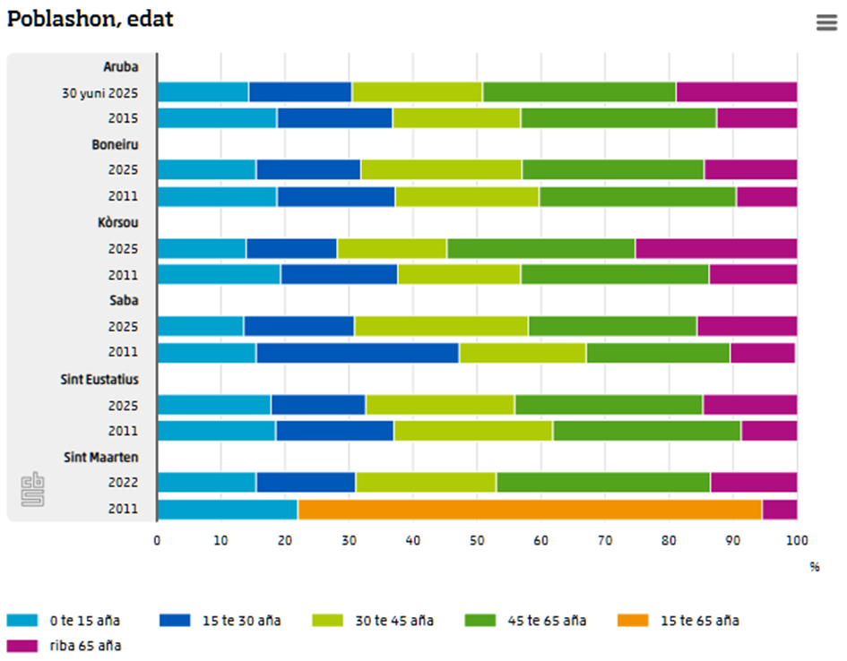 Riba tur isla, envehesimentu di poblashon a oumentá, spesialmente na Kòrsou. Einan, 1 kuart di e poblashon tin 65 aña òf mas. Esaki tabata kasi 14 porshento na 2011. Na Hulanda Karibense, e proporshon di grandinan ta muchu mas abou. Einan, alrededor di 15 porshento di e poblashon tin 65 aña òf mas. Na 2011, esaki tabata mas o ménos 10 porshento.