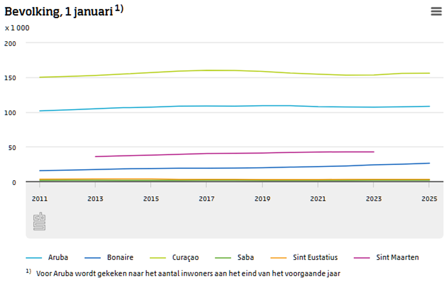 In Caribisch Nederland is Bonaire in 2025 veruit het grootste eiland (bijna 27 duizend inwoners), terwijl Sint Eustatius en Saba respectievelijk ruim 3 duizend en 2 duizend inwoners tellen. Vooral Bonaire heeft een enorme groei doorgemaakt van bijna 70 procent. Dat komt vooral door migratie.