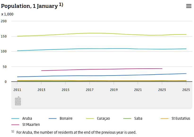 The Caribbean part of the Kingdom has more than 330 thousand inhabitants in 2025. Curaçao has the largest population of any of the islands with 156 thousand residents, followed by Aruba with 108 thousand. St Maarten had a population of 43 thousand in 2023, according to the latest figures.