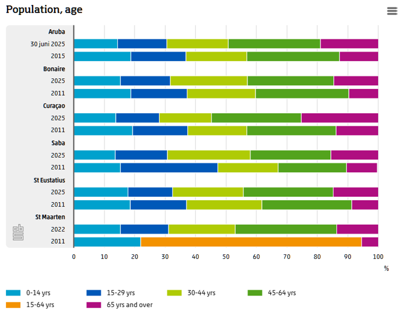 Op alle eilanden is de vergrijzing toegenomen, vooral op Curaçao. Daar is een kwart van de bevolking 65 jaar of ouder. Dit was bijna 14 procent in 2011. In Caribisch Nederland is het aandeel senioren veel lager. Daar is rond 15 procent van de bevolking 65 jaar of ouder. In 2011 was dat ongeveer 10 procent.