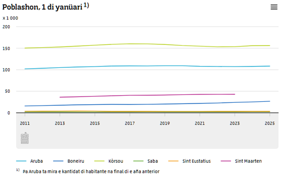 Den Hulanda Karibense, Boneiru ta e isla di mas grandi na 2025 (kasi 27 mil habitante), miéntras ku Sint Eustatius i Saba tin riba 3 mil i 2 mil habitante, respektivamente. Partikularmente, Boneiru a konosé un kresementu enorme di kasi 70 porshento. Esaki ta debí prinsipalmente na migrashon.