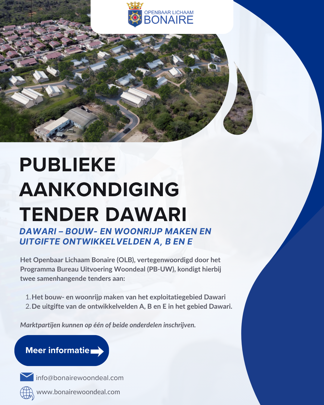 Kralendijk – Het Openbaar Lichaam Bonaire (OLB), vertegenwoordigd door het Programma Bureau Uitvoering Woondeal (PB-UW), kondigt hierbij twee samenhangende tenders aan: het bouw- en woonrijp maken van het exploitatiegebied Dawari, en de uitgifte van de ontwikkelvelden A, B en E in het gebied Dawari. Beide tenders worden gelijktijdig gepubliceerd. Marktpartijen kunnen op één of beide onderdelen inschrijven.